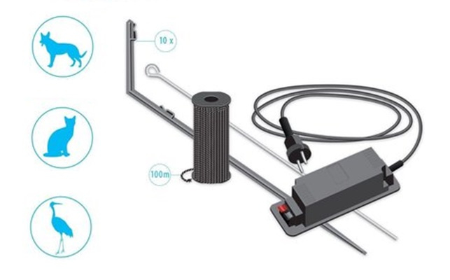 Werking: Deze schrikdraadset beschermt uw vijver en vissen tegen reigers, katten, honden en dergelijke.